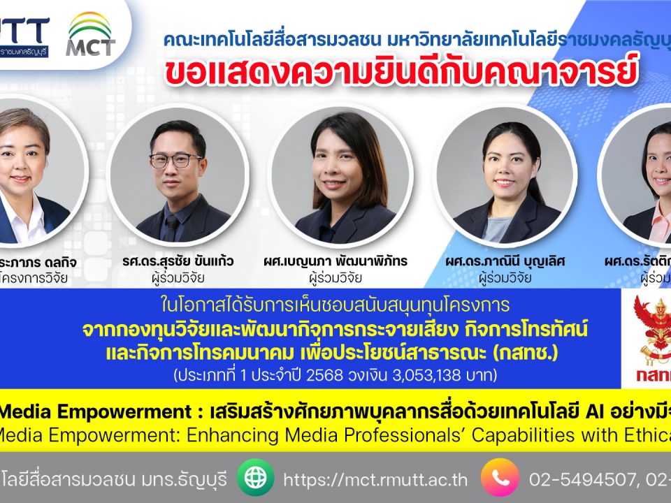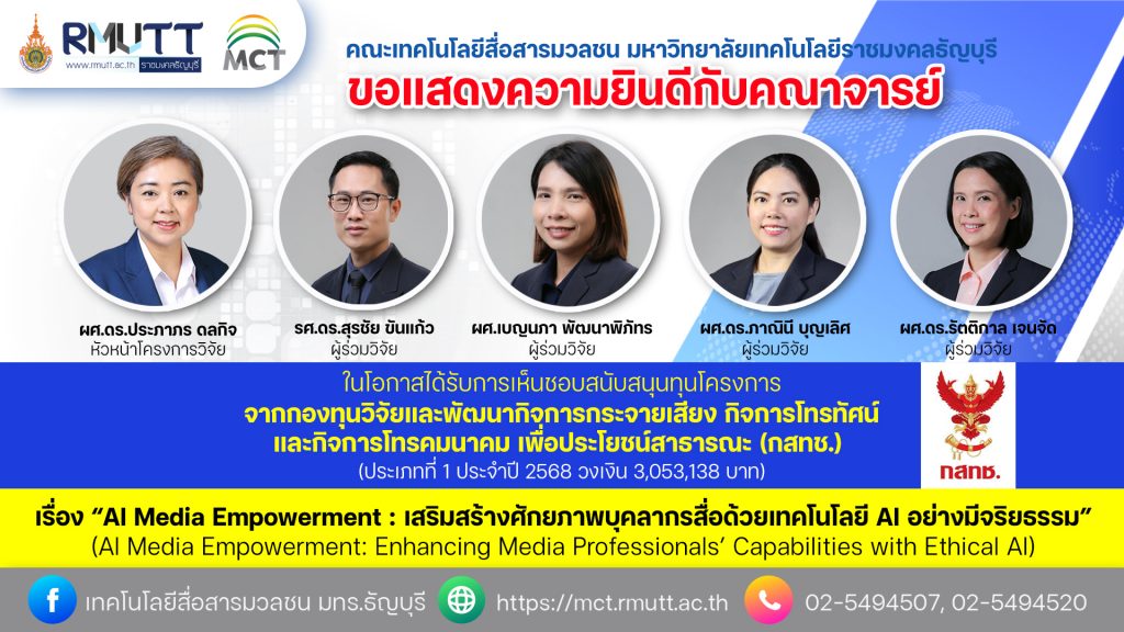 ขอแสดงความยินดีกับคณาจารย์คณะเทคโนโลยีสื่อสารมวลชน มหาวิทยาลัยเทคโนโลยีราชมงคลธัญบุรี ในโอกาสได้รับทุนโครงการ “AI Media Empowerment : เสริมสร้างศักยภาพบุคลากรสื่อด้วยเทคโนโลยี AI อย่างมีจริยธรรม” (AI Media Empowerment: Enhancing Media Professionals’ Capabilities with Ethical AI) จากกองทุนวิจัยและพัฒนากิจการกระจายเสียง กิจการโทรทัศน์ และกิจการโทรคมนาคม เพื่อประโยชน์สาธารณะ (กสทช.) ประเภทที่ […]
