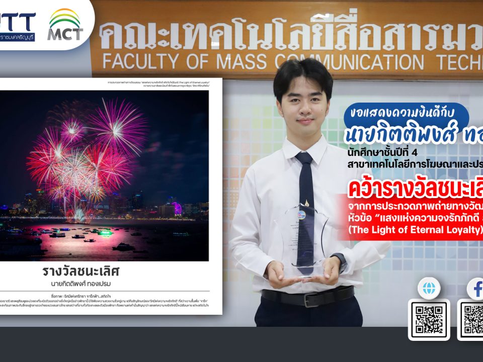 ประกาศประกวดราคาซื้อชุดผลิตรายการทางภาพและเสียงเพื่อทำการออกอากาศออนไลน์ จำนวน ๑ ชุด ด้วยวิธีประกวดราคาอิเล็กทรอนิกส์ (e-bidding)13 September 2023ประกาศคณะกรรมการอำนวยการเลือกตั้ง กรรมการประจำคณะจากคณาจารย์ประจำ25 October 2023 20 September 2023 Categories News Release Tags ประกาศรับสมัครสอบคัดเลือกบุคคลเพื่อบรรจุเป็นพนักงานพิเศษเงินรายได้ ตำแหน่งนายช่างเทคนิค และตำแหน่งพนักงานขับรถยนต์ รายละเอียดประกาศรับสมัครตำแหน่ง ช่างเทคนิค รายละเอียดประกาศรับสมัครตำแหน่งพนักงานขับรถยนต์ จ้างเหมา ผู้สนใจสามารถติดต่อขอรับและยื่นใบสมัครได้ที่ คณะเทคโนโลยีสื่อสารมวลชน ชั้น 1 มหาวิทยาลัยเทคโนโลยีราชมงคลธัญบุรี โทรศัพท์ 02 549 4500 ตั้งแต่วันที่ 18 – 26 กันยายน 2566 Post Views: 71 Share0 Related posts11 March 2026นักศึกษาชั้นปีที่ 1 และ 2 หลักสูตรเทคโนโลยีการผลิตภาพยนตร์และวิทยุโทรทัศน์ (FTP) อบรมเชิงปฏิบัติการโครงการเพิ่มทักษะวิชาชีพด้าน NEW MEDIA และสื่อดิจิตอลRead more11 March 2026ฝ่ายพัฒนานักศึกษา ได้จัดโครงการอบรมทักษะการผลิตผลงานจากโปรแกรม Artificial Intelligence (AI)Read more11 March 2026ขอแสดงความยินดีกับนักศึกษา หลักสูตรเทคโนโลยีการถ่ายภาพและภาพยนตร์ ได้รับรางวัลรองชนะเลิศ อันดับที่ 1 การประกวดสื่อโฆษณาเชิงสร้างสรรค์ (ประเภทคลิปวิดีโอสั้น)Read more