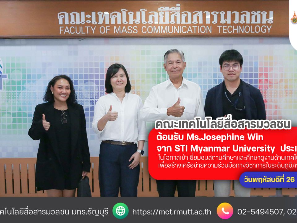 ในวันพุธที่ 12 กุมภาพันธ์ 2563 ศาสตราจารย์ Miyoshi Ayama คณบดีวิทยาลัยวิศวกรรมศาสตร์ พร้อมด้วยผู้ติดตาม รองศาสตราจารย์ Tomoharu Ishikawa ได้เดินทางมายังคณะเทคโนโลยีสื่อสารมวลชน มทร.ธัญบุรี เพื่อลงนามความร่วมมือทางวิชาการระหว่างคณะเทคโนโลยีสื่อสารมวลชน กับ วิทยาลัยวิศวกรรมศาสตร์ มหาวิทยาลัย Utsunomiya ในการนี้ผู้ช่วยศาสตราจารย์ ดร. สมหมาย ผิวสะอาด อธิการบดีมหาวิทยาลัยเทคโนโลยีราชมงคลธัญบุรี และ ศาสตราจารย์ Miyoshi Ayama คณบดีวิทยาลัยวิศวกรรมศาสตร์ เป็นผู้ลงนามความร่วมมือทางวิชาการ หรือ MOU การลงนามในครั้งนี้มีวัตุระสงค์เพื่อแลกเปลี่ยนองค์ความรู้และแลกเปลี่ยนนักศึกษา นักวิจัย ทั้งด้านวิชาการ งานวิจัย และการทดลอง