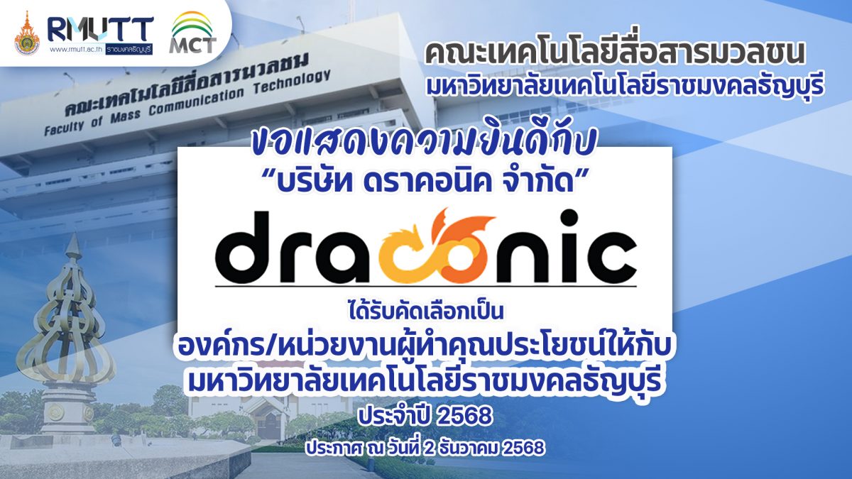 ขอแสดงความยินดีกับ ผศ.นัจภัค มีอุสาห์ ได้รับคัดเลือกให้เป็น “บุคลากรดีเด่น” ประจำปี 256819 December 2025ภาพบรรยากาศกิจกรรมการจัดการความรู้ ระดับคณะ ครั้งที่ 1 ปีการศึกษา 256919 December 2025 19 December 2025 Categories News Release Tags ขอแสดงความยินดีกับ “บริษัท ดราคอนิค จำกัด” ได้รับคัดเลือกให้เป็นองค์กร/หน่วยงานผู้ทำคุณประโยชน์ให้กับมหาวิทยาลัยเทคโนโลยีราชมงคลธัญบุรี ประจำปี 2568 ประกาศ ณ วันที่ 2 ธันวาคม 2568 Post Views: 13 Share0 Related posts31 January 2026ภาพบรรยากาศ โครงการสถาบันการเขียนบทประเทศไทย Script Writing Academy Thailand (K- Script LAB)Read more31 January 2026กิจกรรมเปิดโลกทัศน์สู่เส้นทางการฝึกสหกิจต่างประเทศในโครงการ “CWIE Inter Connect: เชื่อมโลกการทำงาน สู่ประสบการณ์สากล”Read more30 January 2026ภาพบรรยากาศกิจกรรมวันที่หก 21 มกราคม 2569 การเข้าร่วม Thai Cultural Immersion & Educational Exchange Program ของนักศึกษาจีนRead more