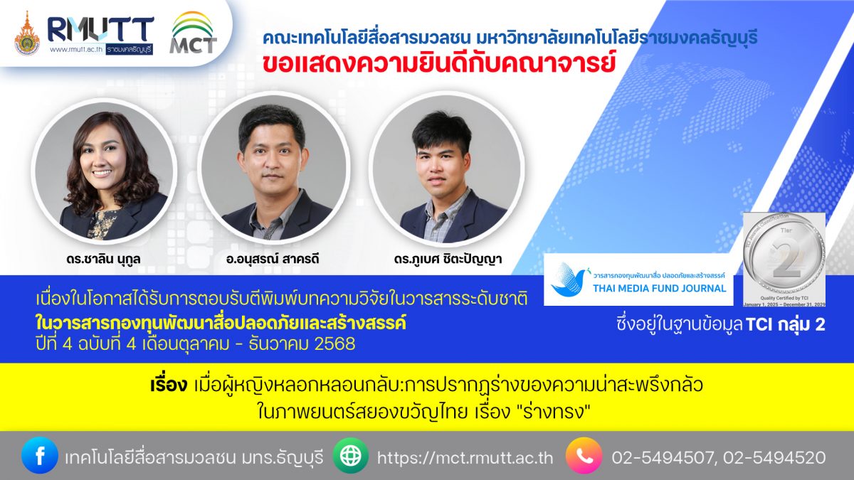 คณะเทคโนโลยีสื่อสารมวลชน มทร.ธัญบุรี ขอแสดงความยินดีกับ ดร.ชาลิน นุกูล อาจารย์อนุสรณ์ สาครดี และ ดร.ภูเบศ ชิตะปัญญา เนื่องในโอกาสได้รับการตอบรับตีพิมพ์บทความวิจัยในวารสารระดับชาติ เรื่อง เมื่อผูู้หญิงหลอกหลอนกลับ:การปรากฏร่างของความน่าสะพรึงกลัวในภาพยนตร์สยองขวัญไทยเรื่อง “ร่างทรง” ในวารสารกองทุนพัฒนาสื่อปลอดภัยและสร้างสรรค์ ปีที่ 4 ฉบับที่ 4 เดือนตุลาคม – ธันวาคม 2568