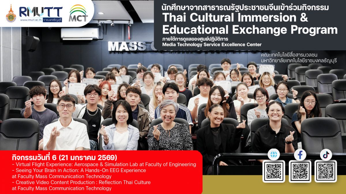 ภาพบรรยากาศกิจกรรมวันที่หก 21 มกราคม 2569 การเข้าร่วม Thai Cultural Immersion & Educational Exchange Program ของนักศึกษาจีน ภายใต้การดูแลของศูนย์ปฏิบัติการ Media Technology Service Excellence Center คณะเทคโนโลยีสื่อสารมวลชน โดยในโปรแกรมมีเนื้อหาการเรียนรู้แบบสหศาสตร์ เช่น การทำคอนเทนต์สื่อสร้างสรรค์ การเรียนภาษาไทย การเรียนรู้เรื่องธุรกิจ เป็นต้น ผสมผสานกับการทำกิจกรรมเสริมสร้างประสบการณ์การเรียนรู้วัฒนธรรมไทยที่สนุกสนาน