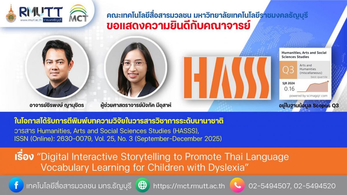คณะเทคโนโลยีสื่อสารมวลชน มหาวิทยาลัยเทคโนโลยีราชมงคลธัญบุรี ขอแสดงความยินดีแก่ อาจารย์ชิรพงษ์ ญานุชิตร และ ผู้ช่วยศาสตราจารย์นัจภัค มีอุสาห์ ในโอกาสได้รับการตีพิมพ์บทความวิจัยในวารสารวิชาการระดับนานาชาติ เรื่อง “Digital Interactive Storytelling to Promote Thai Language Vocabulary Learning for Children with Dyslexia” ซึ่งได้รับการเผยแพร่ในวารสาร Humanities, Arts and Social Sciences Studies (HASSS), ISSN (Online): 2630-0079, Vol. 25, No. 3 (September–December 2025) ซึ่งจัดอยู่ในฐานข้อมูล Scopus Q3 บทความวิจัยชิ้นนี้จัดทำร่วมกับ รองศาสตราจารย์ ดร. กรรวิภาร์ หงส์งาม รองศาสตราจารย์ ดร. จิระ จิตสุภา และ รองศาสตราจารย์ ดร. วีณัฐ สกุลหอม ทีมวิจัยจากมหาวิทยาลัยสวนดุสิต