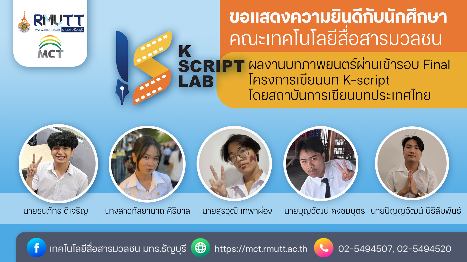 โดยนักศึกษาประกอบด้วย นายธนภัทร ดีเจริญ นักศึกษาสาขาวิชาเทคโนโลยีการผลิตภาพยนตร์และวิทยุโทรทัศน์ นายปัญญวัฒน์ นิธิสัมพันธ์ นายสุรวุฒิ เทพาผ่อง นางสาวกัลยานาถ ศิริบาล และนายบุญวัฒน์ คงชมบุตร สาขาวิชาครีเอทีฟมีเดียเทคโนโลยี นักศึกษาจะได้รับโอกาสเข้าร่วมการอบรมการใช้งานโปรแกรม Final Draft สำหรับผู้ผ่านเข้ารอบ ในวันที่ 17-19 เมษายน 2569 และจะได้เข้าสู่เวที Final Pitching นำเสนอบทภาพยนตร์กับค่ายภาพยนตร์ทั้งไทยและต่างประเทศอีกด้วย ซึ่งถือเป็นประสบการณ์สำคัญสำหรับนักศึกษาในการประยุกต์ความรู้และการลงมือปฏิบัติจริงเพื่อเตรียมความพร้อมเข้าสู่อุตสาหกรรมสื่อในระดับสากล