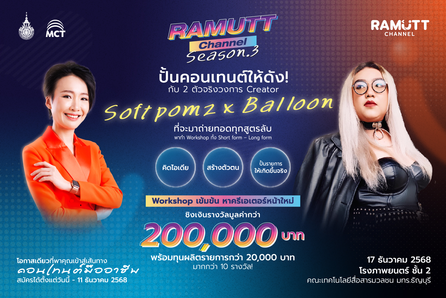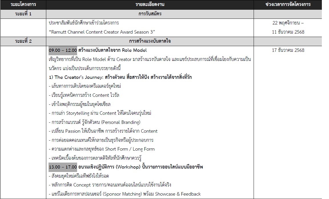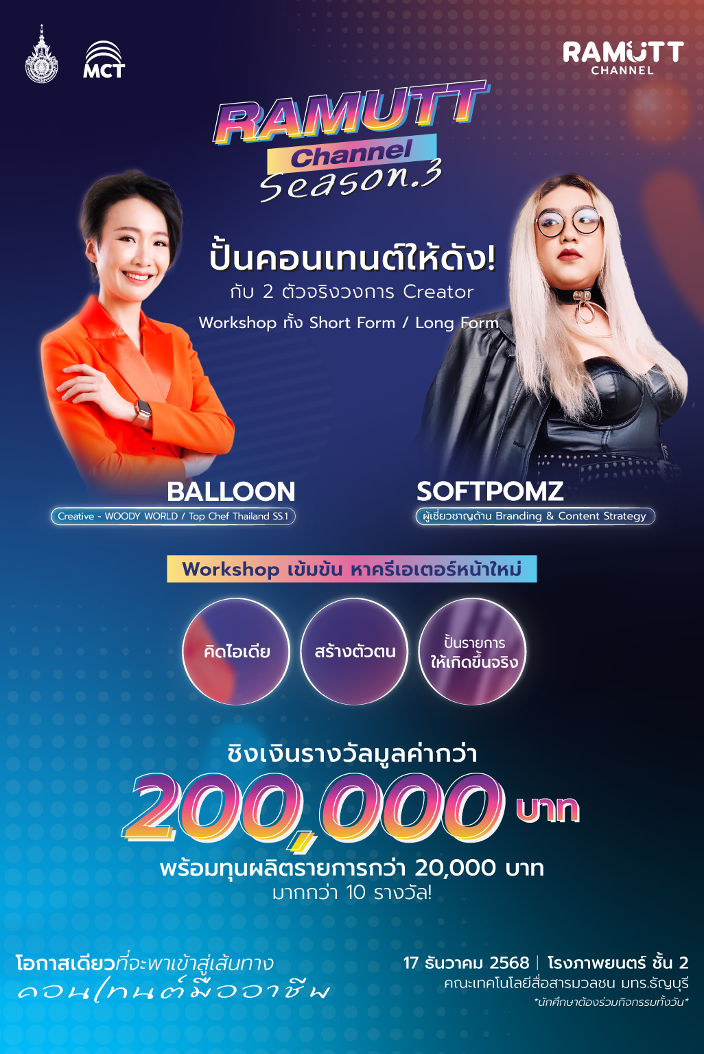 โครงการ Ramutt Channel Content Creator Award Season 3 ดำเนินการจัดกิจกรรมขึ้น เป็นครั้งที่ 3 เพื่อเปิดโอกาสให้นักศึกษาได้มีโอกาสใช้ความคิดสร้างสรรค์และเทคโนโลยีในการผลิตคอนเทนต์ เพื่อสร้างยอดขายบนสื่อออนไลน์ และต่อยอดการเป็นครีเอเตอร์มืออาชีพที่สร้างรายได้อย่างมั่นคง ผ่านช่องทางออนไลน์แพลตฟอร์มของคณะเทคโนโลยีสื่อสารมวลชน Ramutt Channel