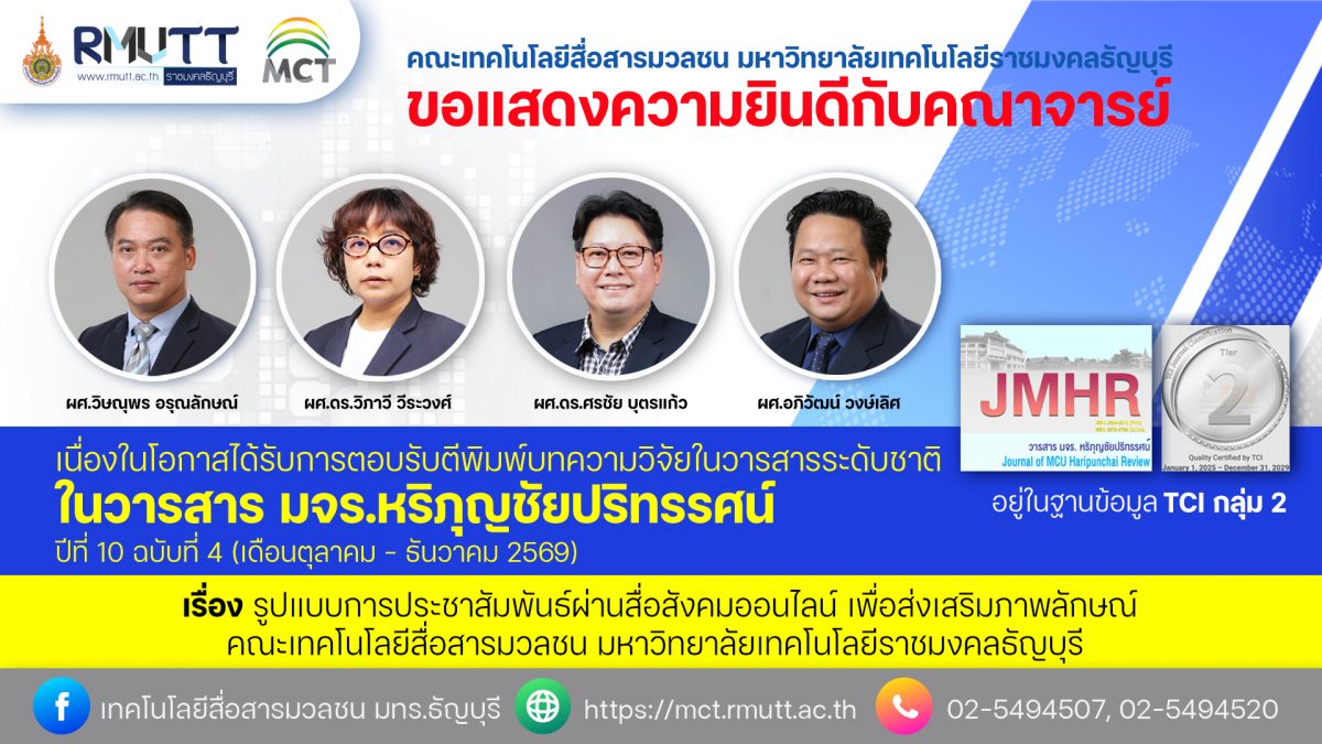 คณะเทคโนโลยีสื่อสารมวลชน มทร.ธัญบุรี ขอแสดงความยินดีกับคณาจารย์ ผศ.สุชาดา คันธารส ผศ.ดร.ศรชัย บุตรแก้ว และผศ.ดร.วิภาวี วีระวงศ์   ที่ได้รับคัดเลือกเข้าร่วมแสดงผลงานศิลปะ นิทรรศการสร้างสรรค์สุนทรียภาพด้านการออกแบบแห่งอีสาน 2569 (Isan Creative Aesthetics Design Exhibition 2026) ในรูปแบบนิทรรศการโลกเสมือนจริง ในระบบออนไลน์   ระหว่างวันที่ 20 เมษายน ถึงวันที่ […]