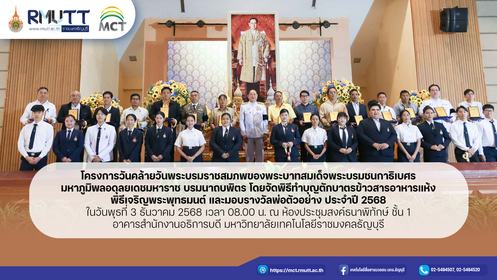 โครงการวันคล้ายวันพระบรมราชสมภพของพระบาทสมเด็จพระบรมชนกาธิเบศร มหาภูมิพลอดุลยเดชมหาราช บรมนาถบพิตร โดยจัดพิธีทำบุญตักบาตรข้าวสารอาหารแห้ง พิธีเจริญพระพุทธมนต์ และมอบรางวัลพ่อตัวอย่าง ประจำปี 2568 ในวันพุธที่ 3 ธันวาคม 2568 เวลา 08.00 น. ณ ห้องประชุมสงค์ธนาพิทักษ์ ชั้น 1 อาคารสำนักงานอธิการบดี มหาวิทยาลัยเทคโนโลยีราชมงคลธัญบุรี