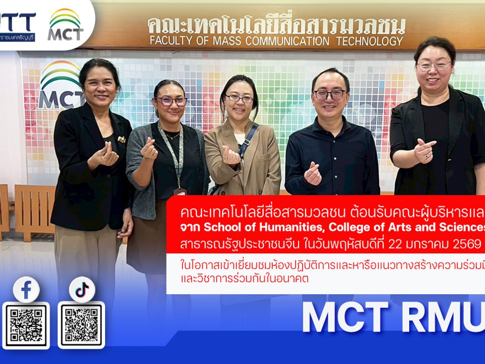 คณะเทคโนโลยีสื่อสารมวลชน เดินหน้าสร้างเครือข่ายวิชาการระดับสากล ต้อนรับคณะผู้บริหารและคณาจารย์จาก Anhui Xinhua University สาธารณรัฐประชาชนจีน ในโอกาสเข้าเยี่ยมชมห้องปฏิบัติการและสตูดิโอ เพื่อเตรียมความพร้อมสู่การจัดทำหลักสูตรความร่วมมือทางการศึกษารูปแบบ 3+1 เมื่อวันที่ 20 มกราคม 2569 ณ คณะเทคโนโลยีสื่อสารมวลชน รองศาสตราจารย์ ดร.สุรชัย ขันแก้ว รองคณบดีฝ่ายบริหารและวางแผน พร้อมด้วย ดร.ชาลิน นุกูล ผู้ช่วยคณบดีด้านการจัดการนักศึกษาต่างชาติ ให้การต้อนรับคณะผู้แทนจาก Anhui Xinhua University จากสาธารณรัฐประชาชนจีน ในโอกาสเดินทางมาศึกษาดูงานและหารือความร่วมมือทางวิชาการ ในการเยี่ยมชมครั้งนี้ คณะคณาจารย์จาก Anhui Xinhua University ได้เข้าศึกษาดูงานภายในห้องปฏิบัติการเฉพาะทางและสตูดิโอของคณะฯ เพื่อประเมินความพร้อมของเครื่องมือและเทคโนโลยีที่จะใช้ในการสนับสนุนการเรียนการสอนสำหรับนักศึกษาในโครงการความร่วมมือ ความร่วมมือครั้งนี้นับเป็นก้าวสำคัญของคณะเทคโนโลยีสื่อสารมวลชน ในการขยายบทบาททางการศึกษาบนเวทีโลก และเป็นการสร้างโอกาสให้นักศึกษาได้เรียนรู้การทำงานสื่อในมิติที่กว้างขึ้นภายใต้การเปลี่ยนแปลงของเทคโนโลยีในปัจจุบัน