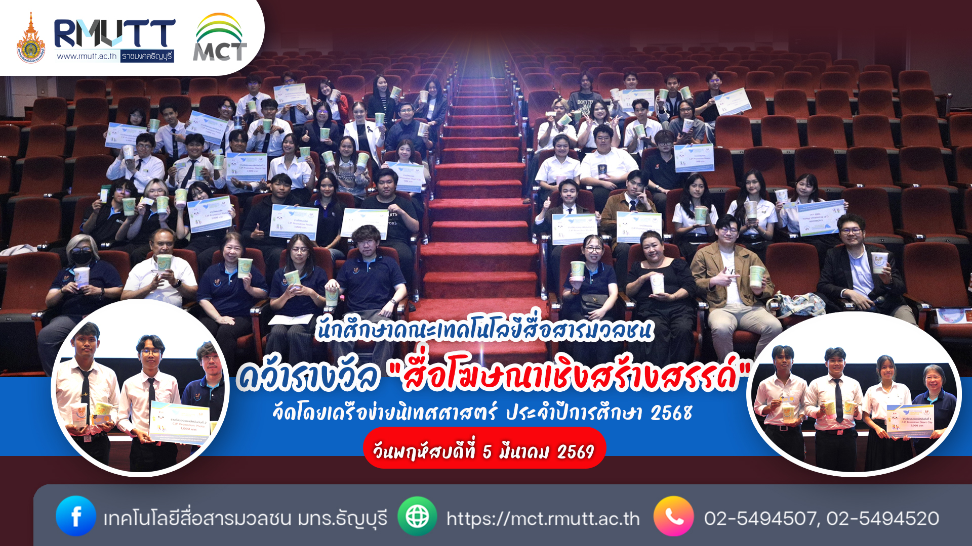 คณะเทคโนโลยีสื่อสารมวลชน มหาวิทยาลัยเทคโนโลยีราชมงคลธัญบุรี ขอแสดงความยินดีกับนักศึกษาสาขาวิชาภาพและเสียง หลักสูตรเทคโนโลยีการถ่ายภาพและภาพยนตร์ ชั้นปีที่ 3 ประกอบด้วย น.ส.ยุวรรดา เกิดเหม็น นายอธิการ วงษ์งามขำ นายวราพงศ์ เจตจิรภาส กลุ่ม PC6621 ได้รับรางวัลรองชนะเลิศ อันดับที่ 1 การประกวดสื่อโฆษณาเชิงสร้างสรรค์ (ประเภทคลิปวิดีโอสั้น) และได้รับรางวัลรองชนะเลิศอันดับ 2 การประกวดสื่อโฆษณาเชิงสร้างสรรค์ (ประเภทภาพถ่าย) ประกอบด้วยนายนครินทร์ คิดรอบ นายสันติภาพ แจ่มสว่าง น.ส.กัญญ์วรา แก้วขวาน้อย กลุ่ม PC6602 จากโครงการประกวดสื่อโฆษณาเชิงสร้างสรรค์ บริษัทซีเจพี แพ็คเกจจิ้ง จำกัด ซึ่งจัดโดยเครือข่ายนิเทศศาสตร์ ประจำปีการศึกษา 2568