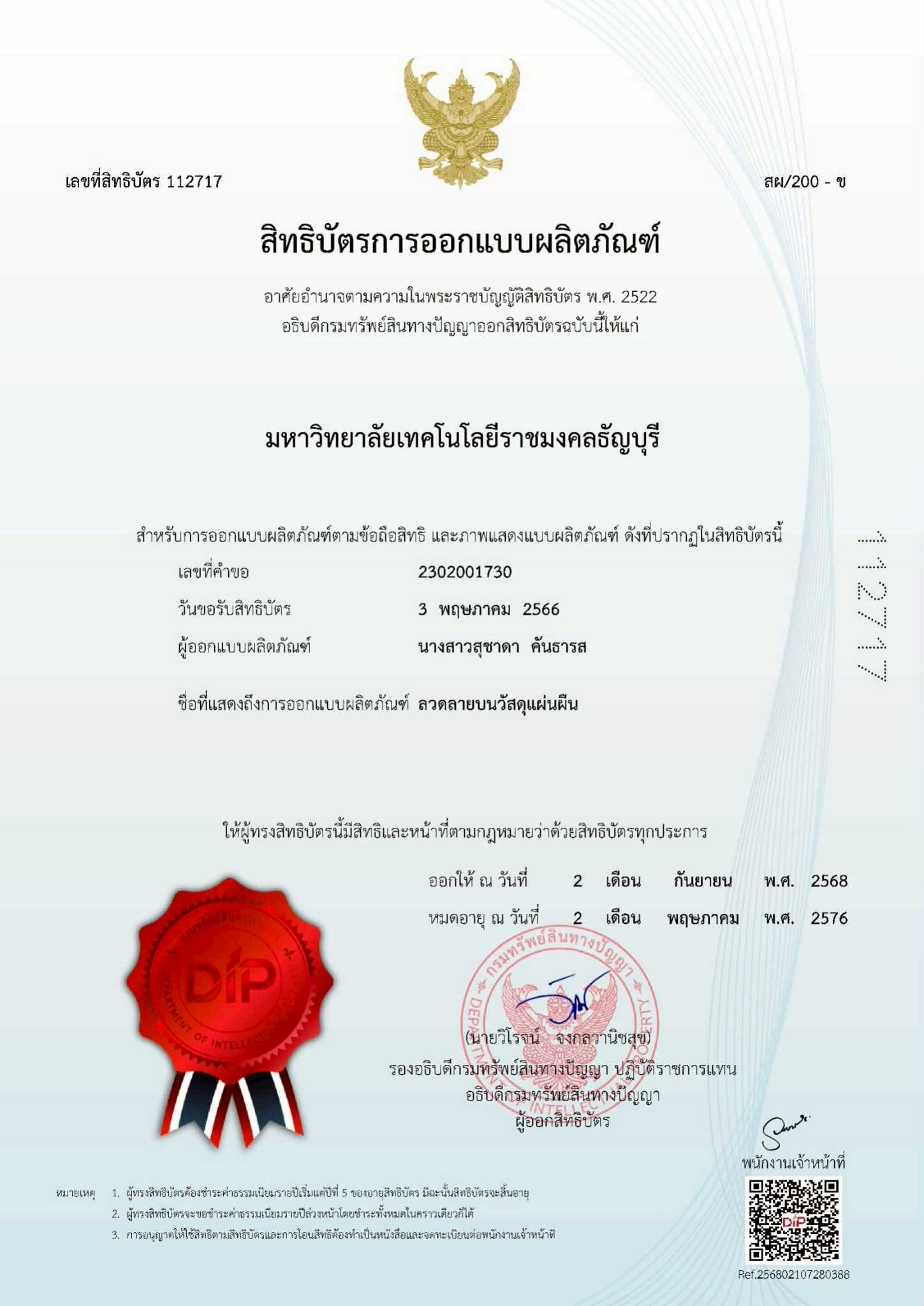ได้รับการรับรองผลงานการออกแบบลวดลายบนวัสดุแผ่นผืนจำนวน 4 ผลงาน