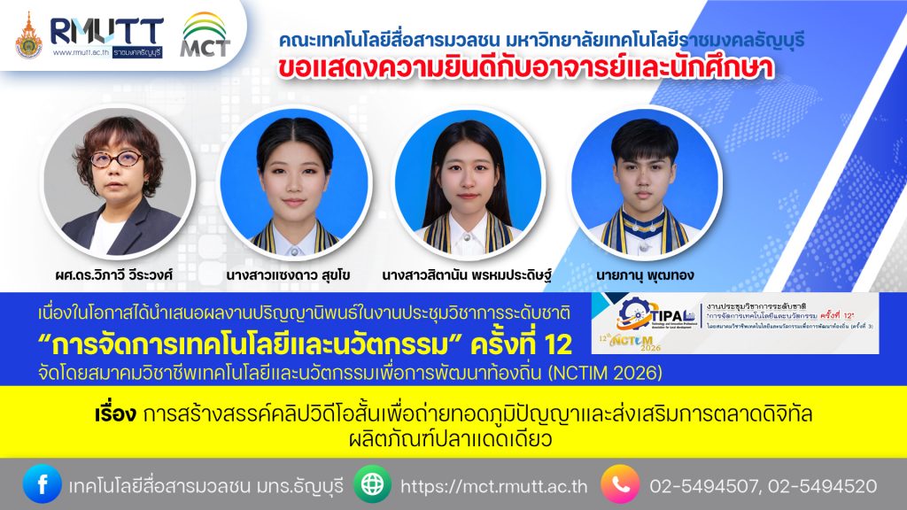 คณะเทคโนโลยีสื่อสารมวลชน มทร.ธัญบุรี ขอแสดงความยินดีกับอาจารย์และนักศึกษา ผศ.ดร.วิภาวี วีระวงศ์ นางสาวแซงดาว สุขโขนางสาวสิตานัน พรหมประดิษฐ์ และนายภานุ พุฒทอง สาขาเทคโนโลยีการโทรทัศน์และวิทยุกระจายเสียง ในโอกาสได้นำเสนอผลงานปริญญานิพนธ์ในงานประชุมวิชาการระดับชาติ “การจัดการเทคโนโลยีและนวัตกรรม” ครั้งที่ 12 จัดโดยสมาคมวิชาชีพเทคโนโลยีและนวัตกรรมเพื่อการพัฒนาท้องถิ่น The 12th National Conference on Technology and Innovation Management […]